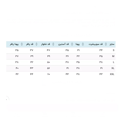 سایز l: قد هودی 38 پهنا 38قد استین از یقه 38 قد پافر 38 قدشلوار 51