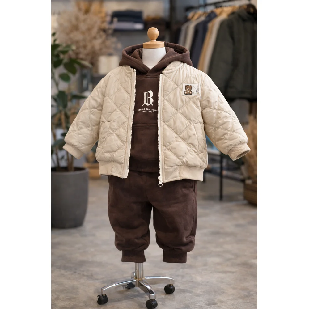 کاپشن کرم با هودی و شلوار قهوه ای