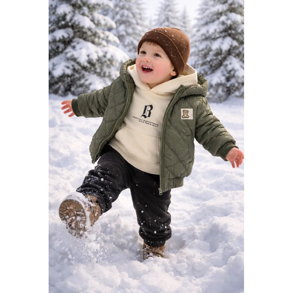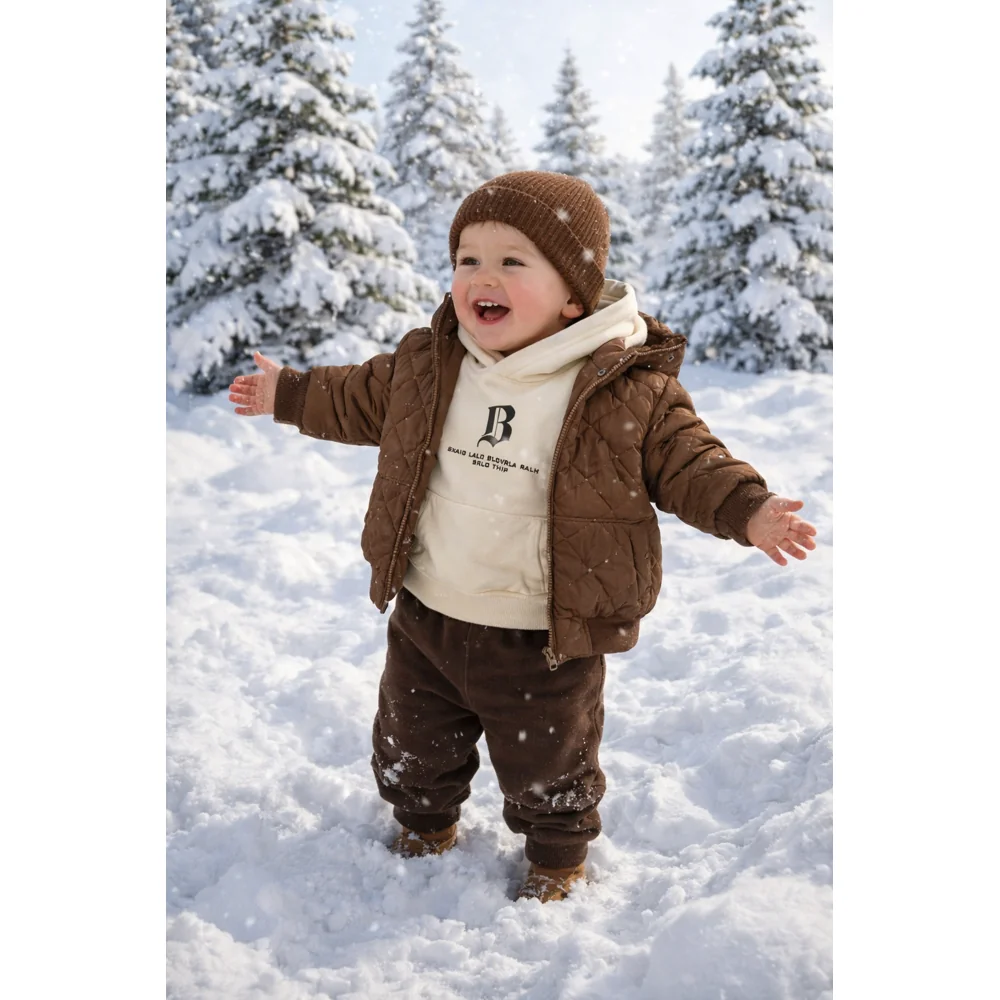 کاپشن قهوه ای با هودی کرم روشن و شلوار قهوه ای